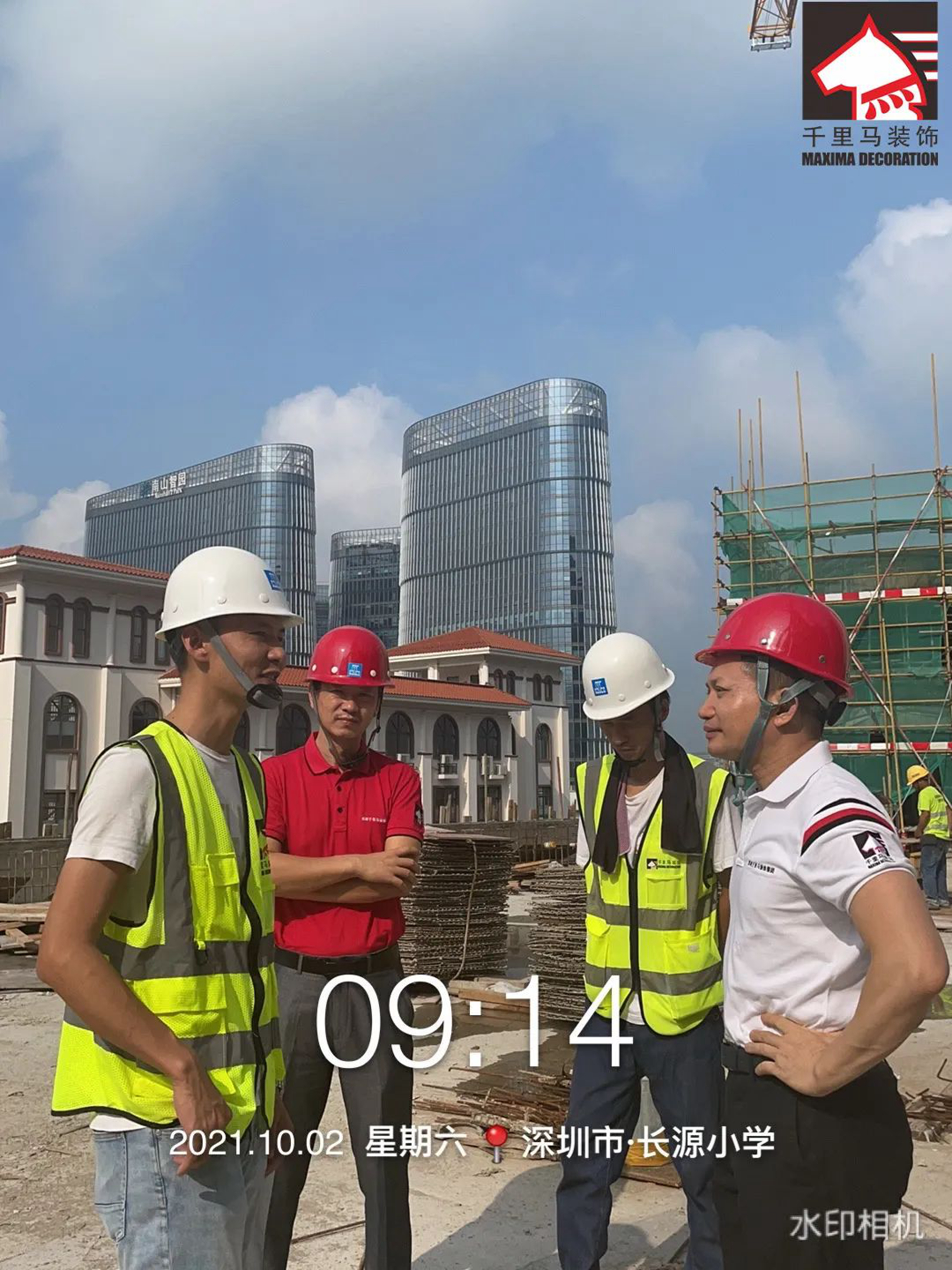 10月2日早上9時,董事長李向東、工管中心副總肖波、行政經理段煉一行人來到長源小學拆除重建工程(二期)項目。此項目位于深圳市南山區桃源街道學苑大道,建筑規模9606平方米,其中地下二層,地上六層。此工程外立面鋁板造型多樣、不平整,現場無法架設吊籃,故采用直臂高空車施工,難度系數較大。且地點位于城市主次干道和住宅小區合圍區域,對施工噪音及高空作業安全措施有極高要求。