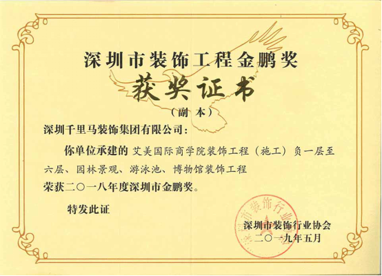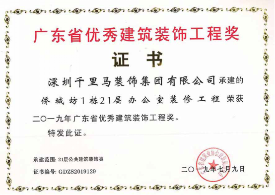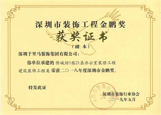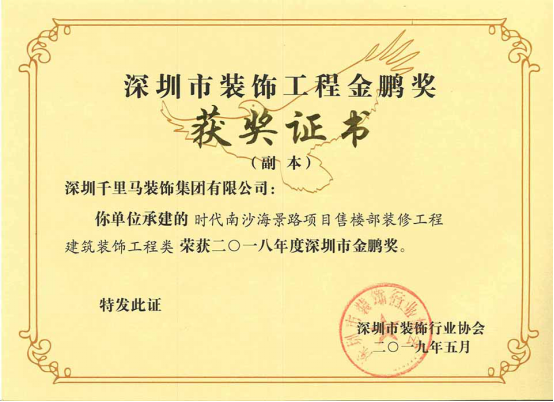 我司承建的僑城坊1棟21層辦公室裝修工程、時代南沙海景路項目售樓部裝修工程、艾美國際商學院裝飾工程三項目,經深圳市裝飾行業協會的專家組嚴格審核,均獲得了2018年度深圳市裝飾工程“金鵬獎”。其中,僑城坊1棟21層辦公室裝修工程,經廣東省建筑業協會組織的專家組嚴格審核,榮獲了2019年廣東省優秀建筑裝飾工程獎。