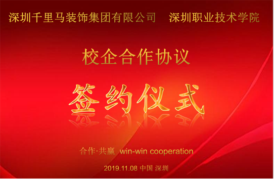 2019年11月8日,深圳千里馬裝飾集團(tuán)有限公司(簡(jiǎn)稱(chēng)深圳千里馬裝飾集團(tuán))與深圳職業(yè)技術(shù)學(xué)院(簡(jiǎn)稱(chēng)深職院)校企合作簽約儀式在深圳千里馬裝飾集團(tuán)總部舉行。